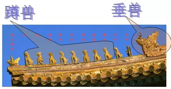 垂(斜)脊的外端(檐角一端)排列着一系列脊饰,最外面是若干个小动物称为蹲兽,最后面龙头状的,称为垂兽。