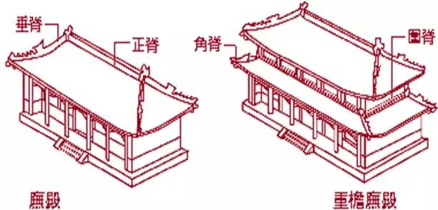 庑殿顶 又称四阿顶,五脊四坡式,又叫五脊顶。前后两坡相交处是正脊,左右两坡有四条垂脊,分别交于正脊的一端。庑殿顶分为单檐和重檐两种,重檐庑殿顶,是在庑殿顶之下,又有短檐,四角各有一条短垂脊,共九脊。现存的古建筑物中,如太和殿和曲阜孔庙大成殿。重檐庑殿顶是清代所有殿顶中最高等级,只有皇帝和孔子的殿堂可以使用。